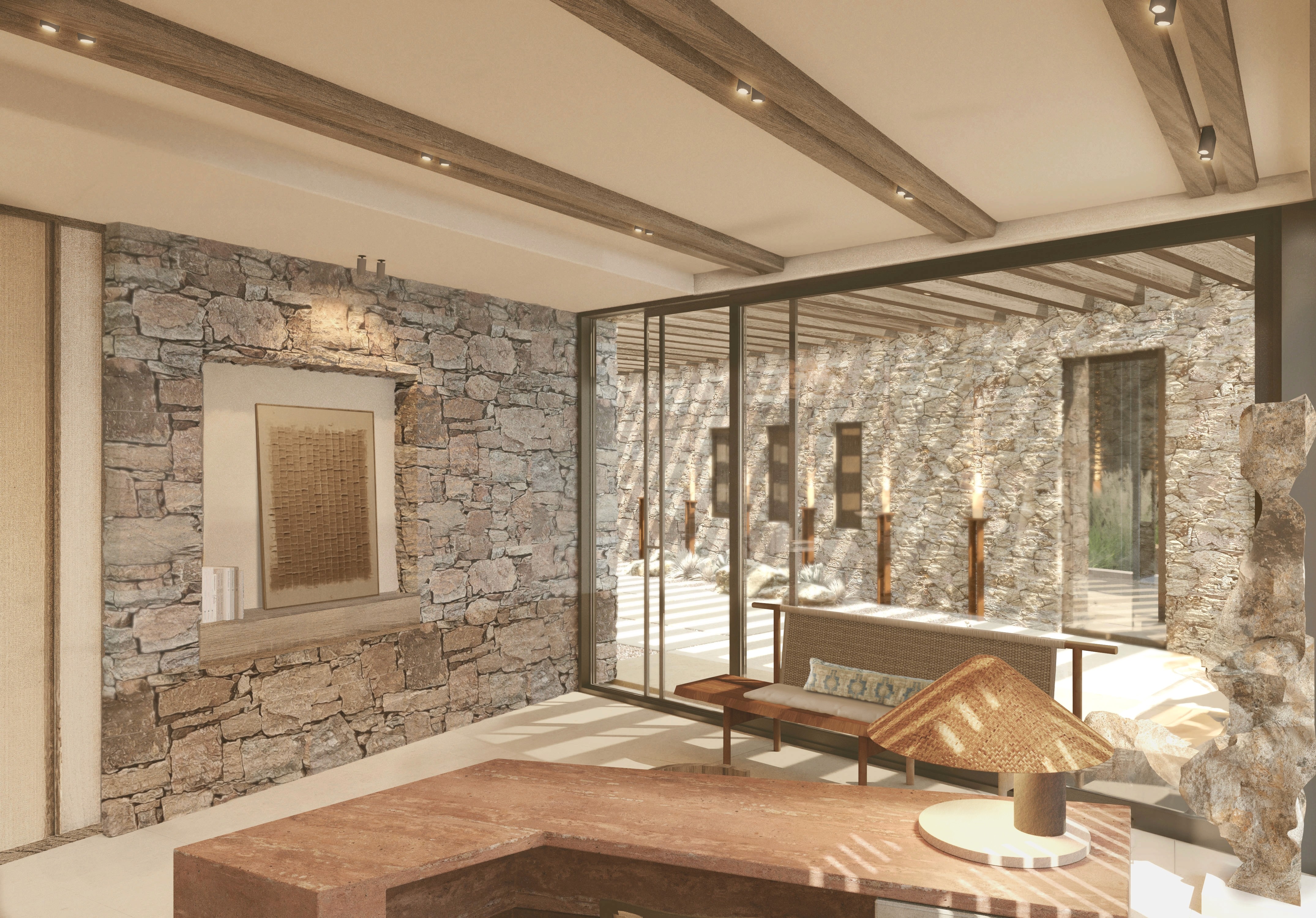 Our design blends the raw beauty of Crete’s natural landscape with understated luxury. Inspired by the island’s nature, history, and architectural tradition, the retreat is sculpted into the terrain using native materials like stone and wood, echoing Cretan craftsmanship while harmonizing with the land. Each structure is positioned to embrace panoramic views, allowing nature to become part of the living space. Our suites and villa are refined yet minimal, and the communal areas are designed to foster both quiet reflection and meaningful connection, mirroring the Cretan way of life, where sharing meals, stories, and moments is a cherished tradition. Our tented pavilions, a rare offering in the Mediterranean, offer the comfort of true luxury in close proximity to nature, without the long-haul travel.