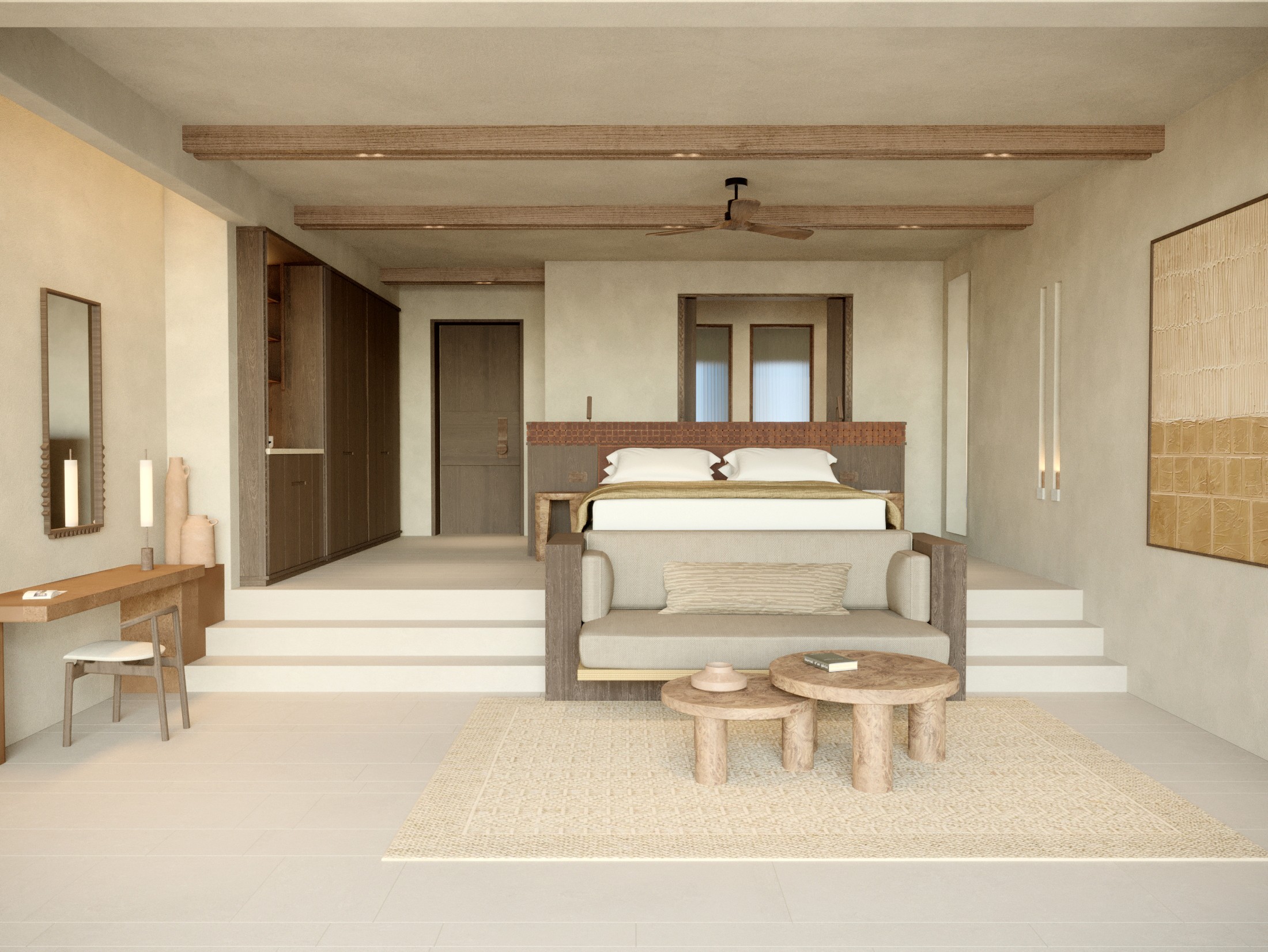 The Horizon Suites offer a fluid, contemporary layout. The open-plan design creates a gentle flow between sleeping, lounging, and outdoor living, all framed by unobstructed sea views and absolute privacy. Each suite opens onto a spacious terrace with a private heated pool, loungers and an outdoor dining table. Crafted with natural materials like marble and local stone, the spaces reflect the textures and tones of the Cretan landscape. Warm, minimal, and intentionally understated, the design allows for a seamless transition between indoors and out, letting the breathtaking views and sunset remain the true focal point.